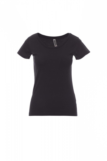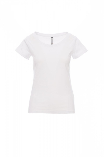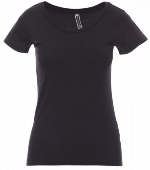 Dames-T-shirt met korte raglanmouwen en brede, verlaagde ronde hals, gemengd met spandex van 1,2 cm, korte, smalle mouwen met gestikte naden opzij voor een betere pasvorm, dubbel stiksel op de schouders en achterkant met band in katoen.