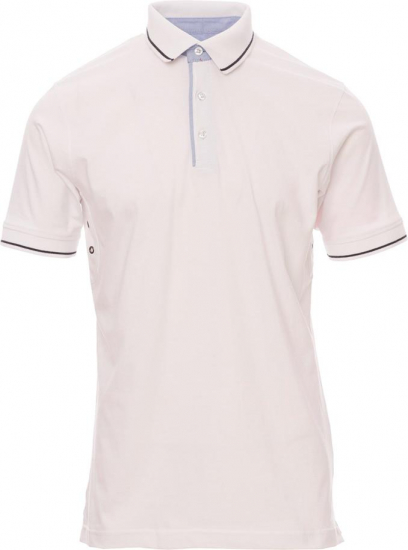 Herenpoloshirt met korte mouwen met 3 witte knopen, binnenkraag, overslag en zijsplitten in Oxfordblauw, ribkraag en mouwboorden met fijne contrasterende strepen, oogjes onder de arm, zijsplitten met versterkte naden, verborgen stiksels bij de kraag, versterkingsband aan de zijkant, elastische naden, band aan de binnenzijde van de nek