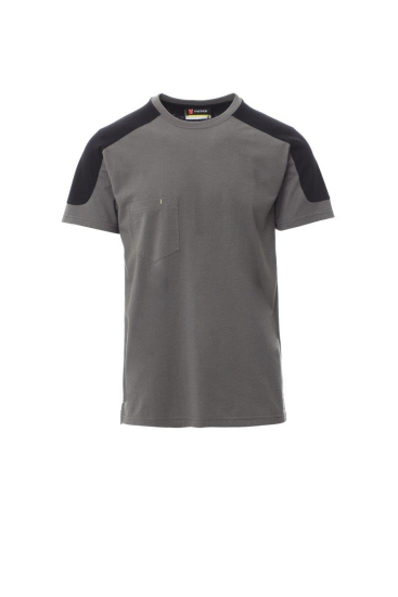 Tweekleurige T-shirt, borstzakje met sleuf voor pen, afgedekt stiksel aan de hals en versterkingsband aan de zijkant.