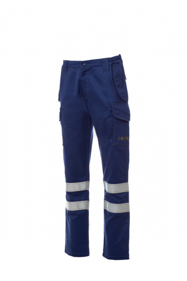 Broek van antistatisch katoen, zuurwerend, brandwerend, bestand tegen vlambogen en geschikt voor lassers, met dubbele reflecterende band, voorgevormde riem hoger achteraan voor een betere bedekking met elastieken aan de zijkant en riemlussen in de taille, vooraan met rits en drukknoop. Dubbele naden in contrast en versterkt aan de binnenkant en buitenkant van de broekspijp en achteraan. Zakken vooraan in klassieke snit, twee multifunctionele zakken plus een zak met rits, twee zakken achteraan, alles bedekt met flappen gesloten met klittenband. Reflecterende 3M-strips op het zakje achteraan.