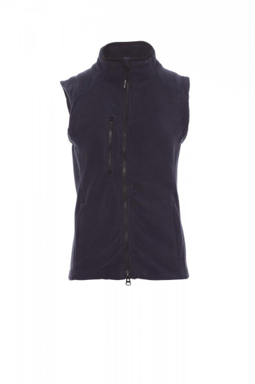 Damesfleecevest, kunststof rits met dubbele runner, raglan pasvorm, twee zakken met verdekte rits voor en een borstzak met rits.