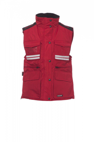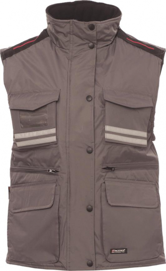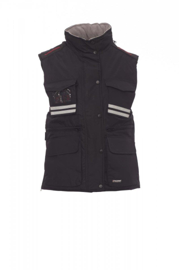 Damesbodywarmer, comfort-fit, kunststof rits van 8 mm met metalen runner met overslag en kunststof knopen, afneembare en/of uitvouwbare gevormde capuchon, grijze reflecterende banden aan de voor- en achterkant, zijsplit met inzetstuk en rits, negen buitenzakken waarvan twee met LOCK SYSTEM, twee met rits en verstevigde binnenzak, een met omkeerbare badgehouder. Binnenzijde: gewatteerd, kraag, rug- en onderrugverwarmer van microfleece, trekkoord in de taille en rits aan de binnenkant voor eenvoudiger bedrukken en borduren.