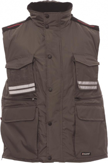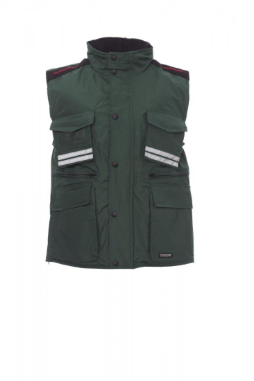 Herenbodywarmer, kunststof rits van 8 mm met metalen runner met overslag en kunststof knopen, afneembare en/of uitvouwbare gevormde capuchon, grijze reflecterende banden aan de voor- en achterkant, zijsplit met inzetstuk en rits, negen buitenzakken waarvan twee met LOCK SYSTEM, twee met rits en verstevigde binnenzak, een met omkeerbare badgehouder. Binnenzijde: gewatteerd, kraag, rug- en onderrugverwarmer van microfleece, trekkoord in de taille en rits aan de binnenkant voor eenvoudiger bedrukken en borduren.