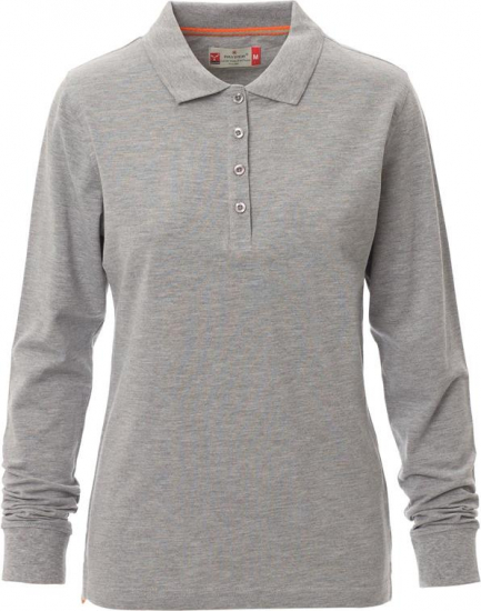 Nauwsluitend damespoloshirt met lange mouwen met 4 bijpassende knopen met parelmoereffect, ribkraag en ribboorden aan de mouwen, zijsplitten, verborgen stiksels bij de kraag met contrasterende band, elastische naden, versterkingsband aan de zijkant, band aan de binnenkant van de nek.