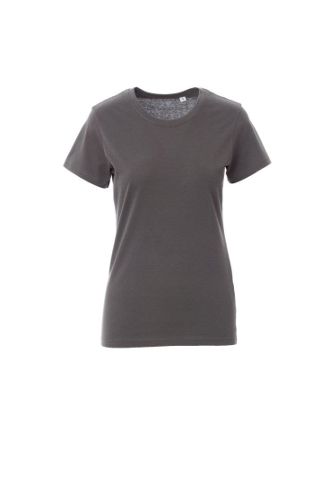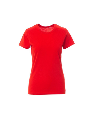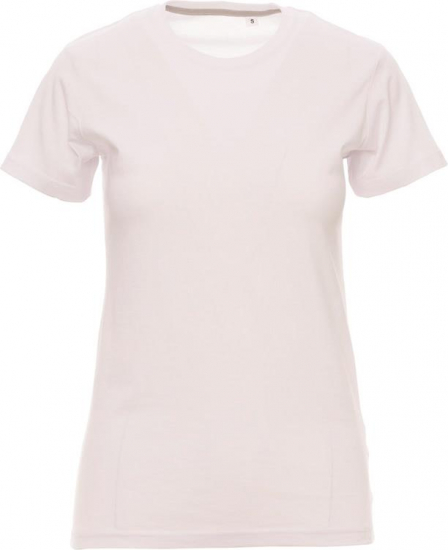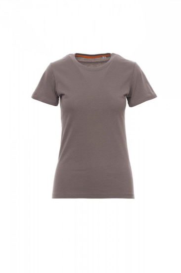 Nauwsluitend dames-T-shirt met korte mouwen en ronde hals, met afgezette geribde halsrand van 1,5 cm van een mix met spandex met stiksel aan de buitenkant, contrasterende versterkingsband van schouder naar schouder zichtbaar aan de binnenkant van de nek, elastische naden, zijnaden. Geen label