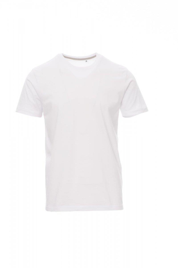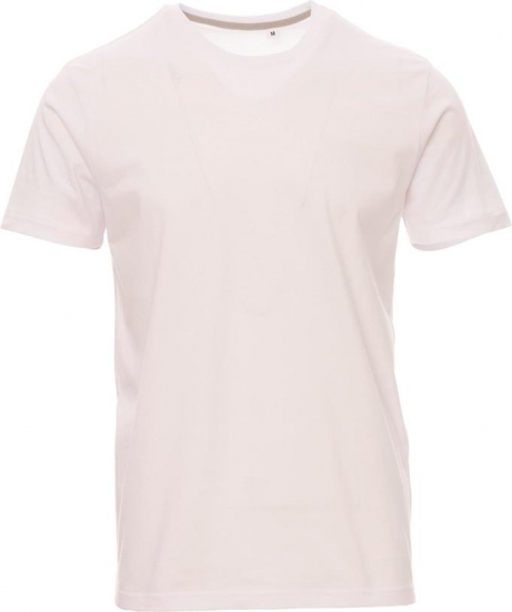 Heren-T-shirt met korte mouwen en ronde hals, met afgezette geribde halsrand van 1,5 cm van een mix met spandex met stiksel aan de buitenkant, contrasterende versterkingsband van schouder naar schouder zichtbaar aan de binnenkant van de nek, elastische naden, zijnaden, geen label.