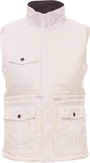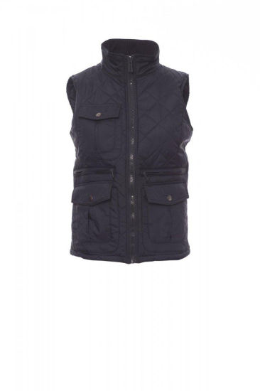 Doorgestikte damesbodywarmer, comfort-fit, kunststof rits van 8 mm met metalen runner, zijsplitten met knoop, vijf buitenzakken, twee met het LOCK SYSTEM. Gewatteerd, binnenkraag van corduroy, een binnenzak.