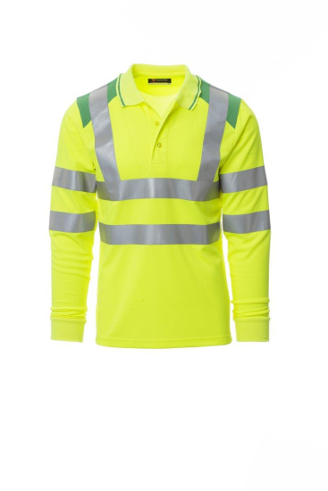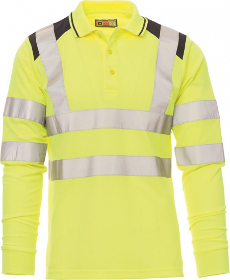 Herenpoloshirt met hoge zichtbaarheid, met lange mouwen, in twee kleuren, met reflecterende strepen, met drie bijpassende knopen met parelmoereffect, contrasterende fijne ribkraag en mouwrand, zijsplitten, verborgen stiksel bij de kraag.