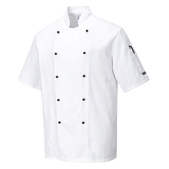 Ontworpen voor hete omgevingen. Deze jas met korte mouwen houdt u koel en zorgt ervoor dat u er goed uit blijft zien. De klassieke vormgeving biedt u een reeks aan kenmerken van hoge kwaliteit, zoals een stof die eenvoudig te onderhouden is en een handige zak op de mouw.