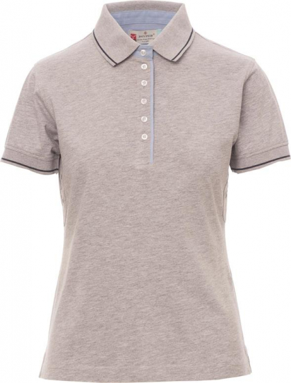 Damespolo met korte raglanmowuen met zes witte knopen met binnenzijde van de hals, overslag en splitten opzij in oxford-lichtblauw, kraag en mouwrand in rib met fijn contrastprofiel, openingen onder de arm.