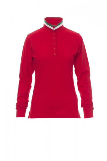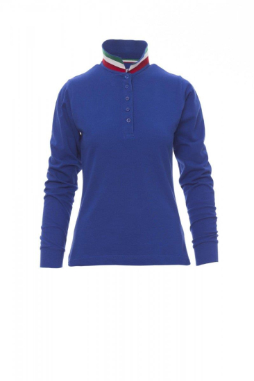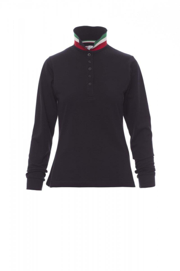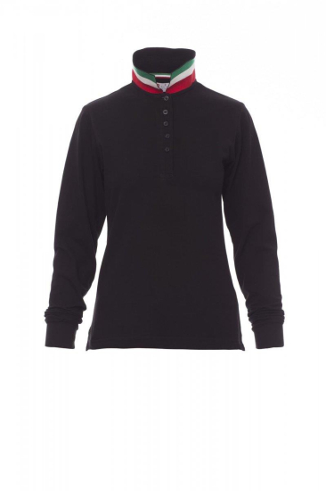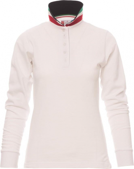 Nauwsluitend damespoloshirt met lange mouwen met 5 bijpassende knopen met parelmoereffect, bijpassende kraag met contrasterende onderkant (kleuren van de vlag). Onderslag met knoopsluiting en zijsplitten met de kleuren van de vlag, geribde kraag- en mouwrand, verborgen stiksels bij de kraag, versterkingsband aan de zijkant.