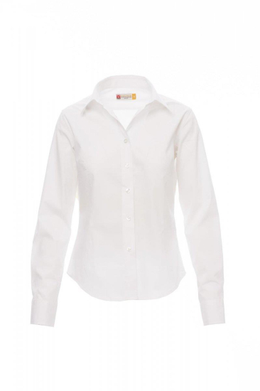 Nauwsluitende, fijngeweven damesblouse van gekamd katoen, plooien aan voor- en achterkant, kraag in Italiaanse stijl, manchetten met 2 knopen en knoopsgat, gestikte knoopsluiting met bijpassende knopen, met schouderpas.