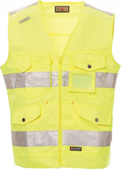 Bodywarmer met hoge zichtbaarheid met 3M strepen, voorsluiting met afgedekte rits, verstelbare tailleband met knopen, twee kangoeroezakken voor met LOCK SYSTEM en met metalen knoop, twee multifunctionele borstzakken, afneembare, uitvouwbare badgehouder. Nauwsluitend model in jeansstijl.