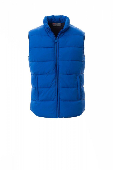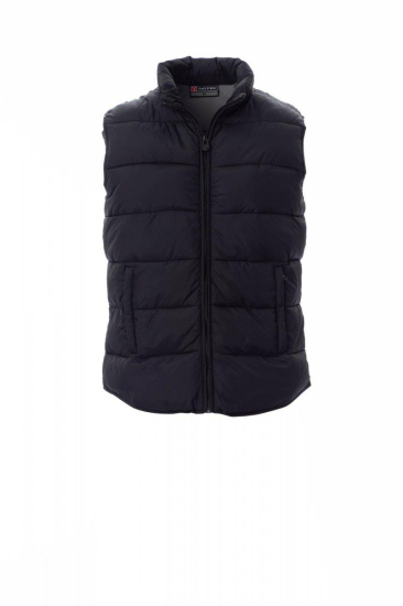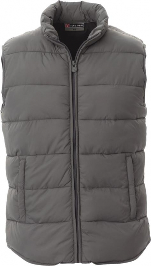 Herenbodywarmer van gewatteerd polyester met donseffect, afgedekte kunststof rits, twee buitenzakken met afgedekte rits, binnenzijde met contrastkleur.