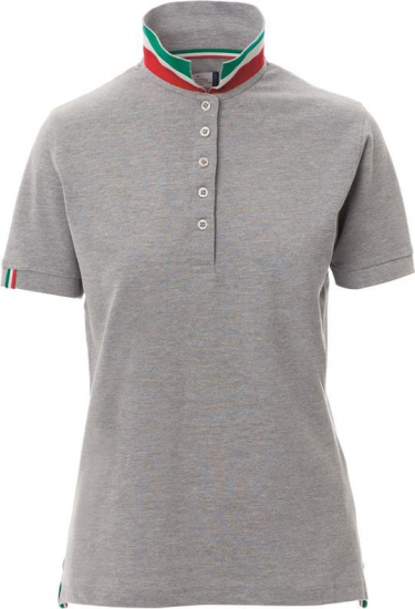 Nauwsluitend damespoloshirt met korte mouwen met 5 bijpassende knopen met parelmoereffect, bijpassende kraag met contrasterende onderkant (kleuren van de vlag), rechte mouwrand in kleur (dezelfde kleur als de kraag), geribde kraag- en mouwrand, rand van zijsplitten in kleuren van de vlag, verborgen stiksels bij de kraag met jersey band (kleuren van de vlag), versterkingsband aan de zijkant, band aan de binnenkant van de nek