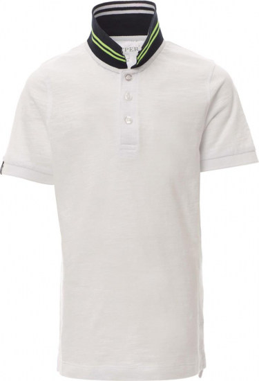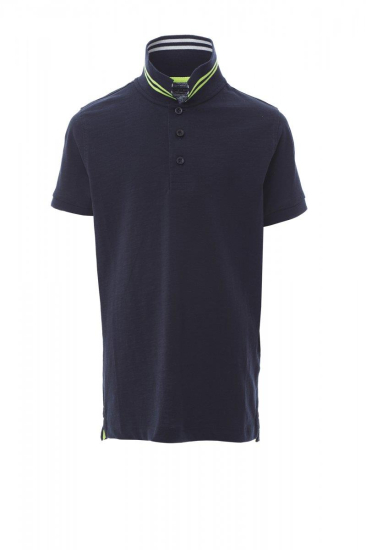 Kinderpoloshirt met korte mouwen met 3 bijpassende knopen met parelmoereffect, kraag met contrasterende strepen en fluorescerende strepen aan de onderkant, ribkraag en geribde mouwrand, rechtermouw met inzetstuk, zijsplitten en verborgen stiksels bij de kraag met reflecterende band, transferlabel.