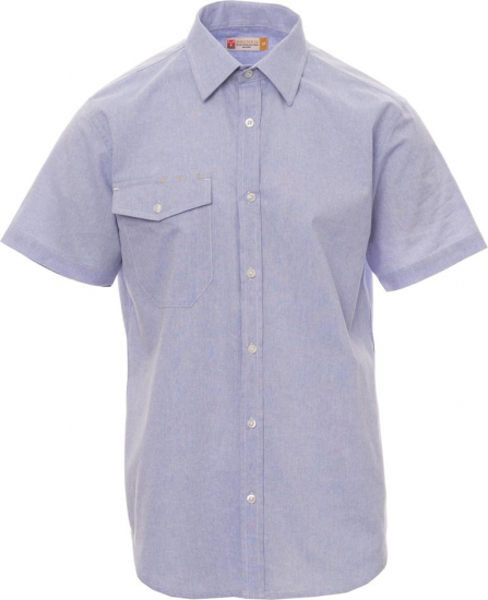 Herenoverhemd met korte mouwen, licht getailleerd model, kraag in Italiaanse stijl, voorpand met zichtbaar gestikte knopenlijst en knopen van dezelfde kleur, achterpand met schouderpas en figuurnaden, een technische borstzak, gesloten met overslag met knoop en twee pensleuven.