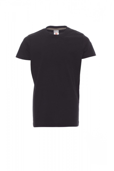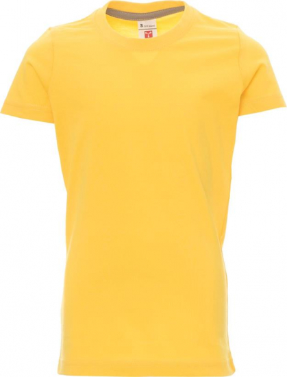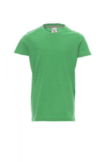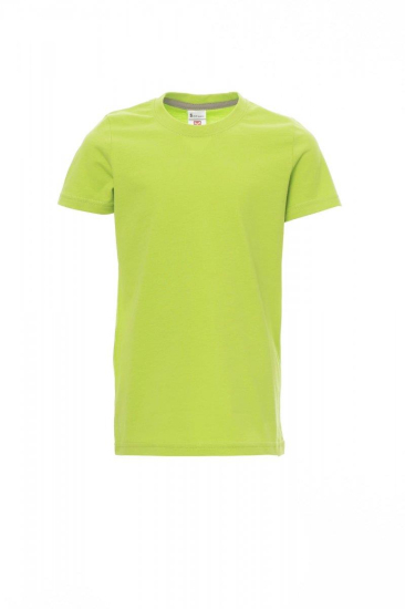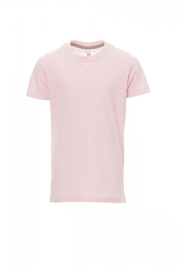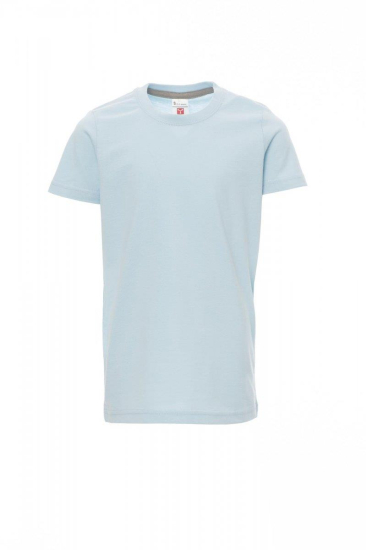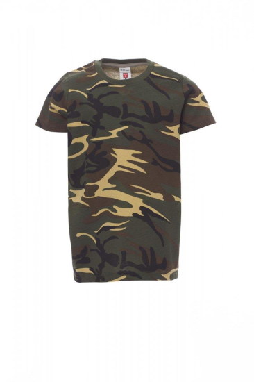 Kinder-T-shirt met korte mouwen en ronde hals, met afgezette geribde halsrand van 1,5 cm van een mix met spandex met stiksel aan de buitenkant, contrasterende versterkingsband van schouder naar schouder zichtbaar aan de binnenkant van de nek, elastische naden, rond ontwerp (camouflage-uitvoering met zijnaden)