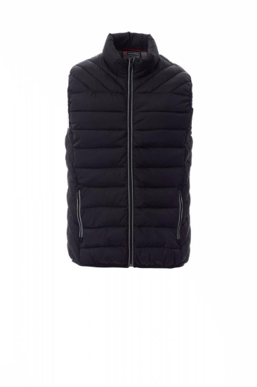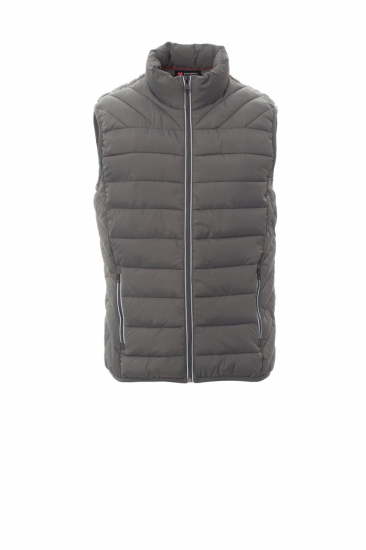 Gilet/gevoerde herenjack, plastic rits 5mm met metalen treklipje, dunne bies ter hoogte van de lendenen, twee zakken aan de buitenkant. Binnenkant: polyester voering met donseffect, twee zakken.