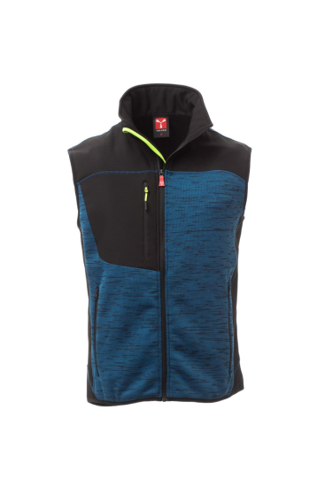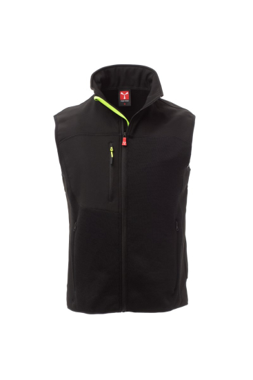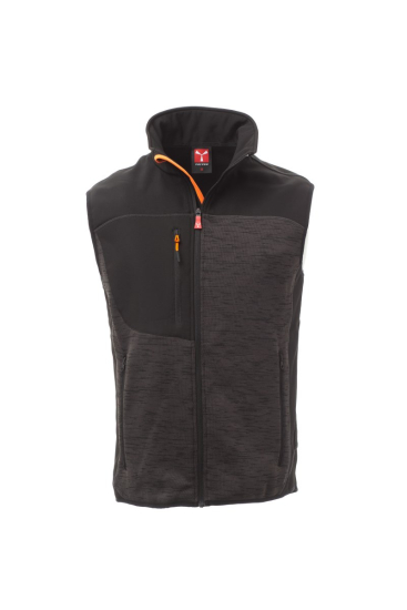 Ergonomische herengilet, ritssluiting met metalen treklipje “semi-autolock” en gepersonaliseerde runner. Dunne bies aan de mouwboourden en in de lendenen, twee zijzakken met rits, één borstzak. Gebreid met inzetstukken van zwarte soft-shell.